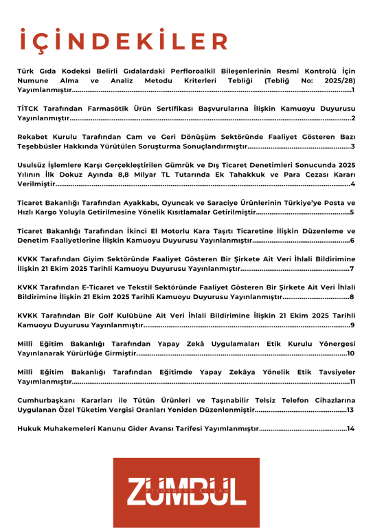 Tarım ve Orman Bakanlığı tarafından Türk Gıda Kodeksi Belirli Gıdalardaki Perfloroalkil Bileşenlerinin Resmî Kontrolü İçin Numune Alma ve Analiz Metodu Kriterleri Tebliği (Tebliğ No: 2025/28) ("Tebliğ”) 21 Ekim 2025 tarihli ve 33054 sayılı Resmî Gazete’de yayımlanmıştır.