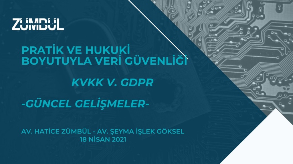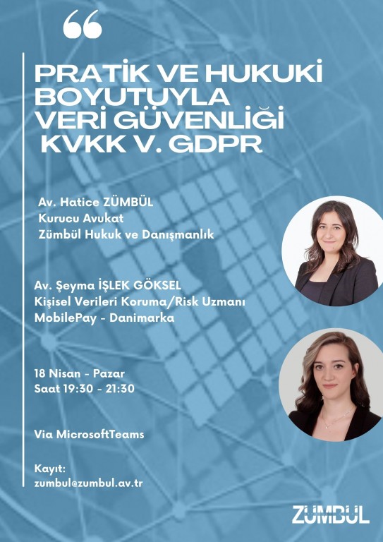 Güncel gelişmeler ışığında, uygulamadan örneklerle ve hukuki boyutuyla veri güvenliği konusunu ele aldığımız webinarımız 18 Nisan 2021 tarihinde gerçekleştirilmiştir. Programda konuşmacı olarak Av. Hatice Zümbül ve Şeyma İşlek Göksel yer almıştır. Program kapsamında;