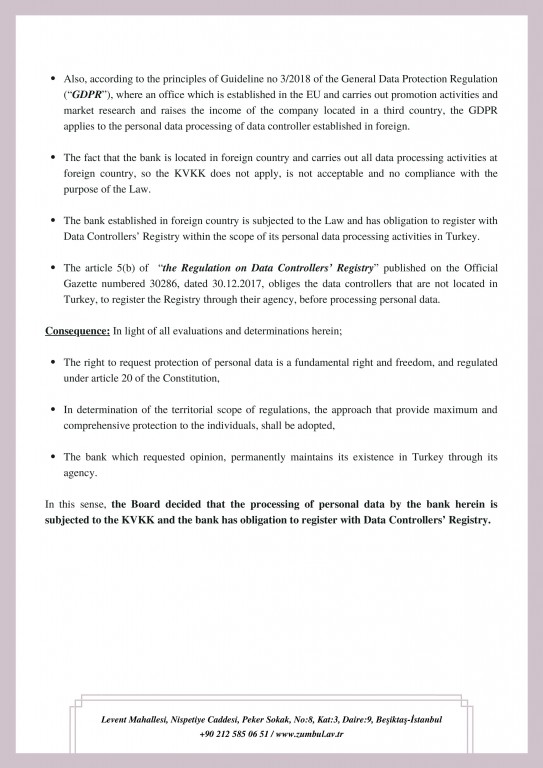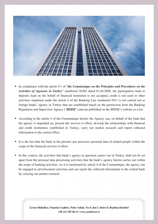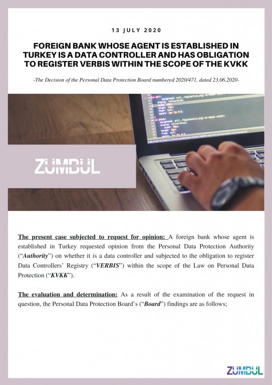 FOREIGN BANK WHOSE AGENT IS ESTABLISHED IN TURKEY IS A DATA CONTROLLER AND HAS OBLIGATION TO REGISTER VERBIS WITHIN THE SCOPE OF THE KVKK