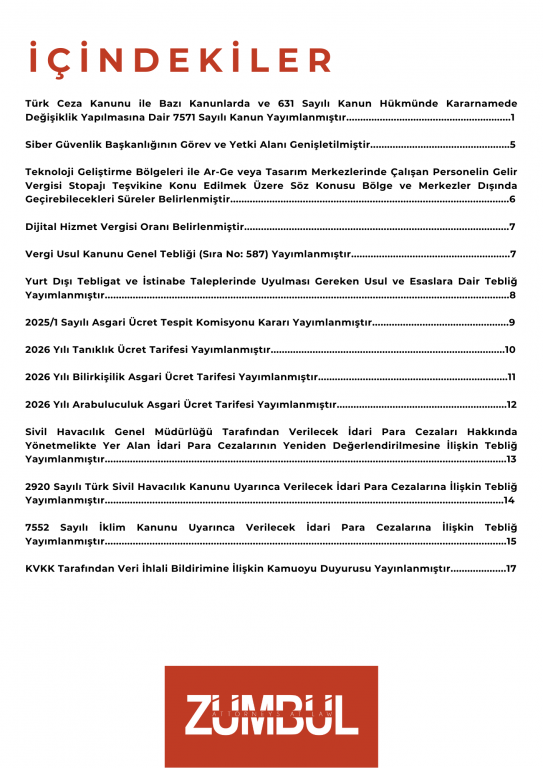 10767 sayılı Cumhurbaşkanı Kararı ile 7194 sayılı Dijital Hizmet Vergisi ile Bazı Kanunlarda ve 375 Sayılı Kanun Hükmünde Kararnamede Değişiklik Yapılması Hakkında Kanunun 5 inci maddesinin üçüncü fıkrasında yer alan dijital hizmet vergisi oranının yeniden belirlenmesi hakkındaki Karar (“Karar”) yürürlüğe girmiştir. Karar 25 Aralık 2025 tarihli ve 33118 sayılı Resmî Gazete’de yayımlanmıştır.
