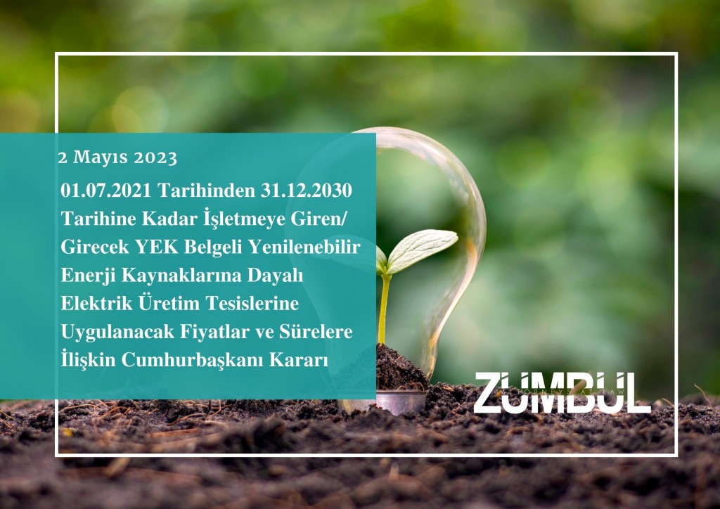 01.07.2021 Tarihinden 31.12.2030 Tarihine Kadar İşletmeye Giren/ Girecek YEK Belgeli Yenilenebilir Enerji Kaynaklarına Dayalı Elektrik Üretim Tesislerine Uygulanacak Fiyatlar ve Sürelere İlişkin Cumhurbaşkanı Kararı