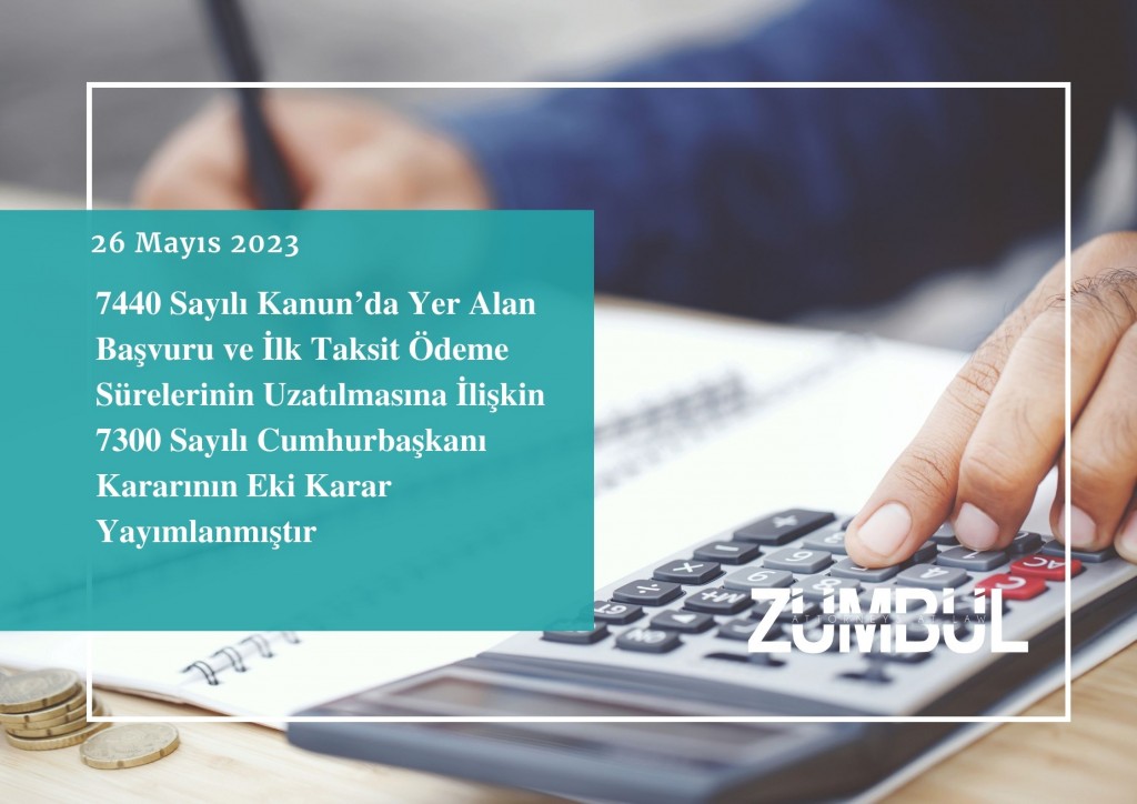 7440 sayılı Bazı Alacakların Yeniden Yapılandırılması ile Bazı Kanunlarda Değişiklik Yapılmasına Dair Kanun’da (“Kanun”) yer alan başvuru ve ilk taksit ödeme sürelerinin uzatılmasına ilişkin 25.05.2023 tarihli ve 7300 sayılı Cumhurbaşkanı Kararının Eki Karar (“Karar”), 26 Mayıs 2023 tarihli ve 32202 sayılı Resmi Gazete’de yayımlanmıştır.