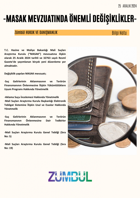 T.C. Hazine ve Maliye Bakanlığı Mali Suçları Araştırma Kurulu (“MASAK”) mevzuatına ilişkin olarak 25 Aralık 2024 tarihli ve 32763 sayılı Resmî Gazete’de yayımlanan birçok yeni düzenleme yer almaktadır.