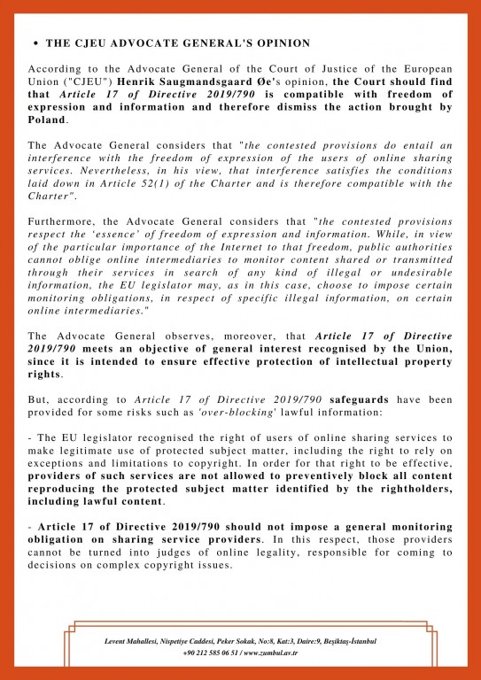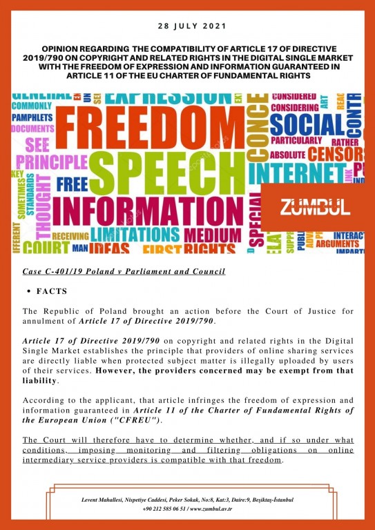AnasayfaYayınlar&DuyurularDuyurularOPINION REGARDING THE COMPATIBILITY OF ARTICLE 17 OF DIRECTIVE 2019/790 ON COPYRIGHT AND RELATED RIGHTS IN THE DIGITAL SINGLE MARKET WITH THE FREEDOM OF EXPRESSION AND INFORMATION GUARANTEED IN ARTICLE 11 OF THE EU CHARTER OF FUNDAMENTAL RIGHTS