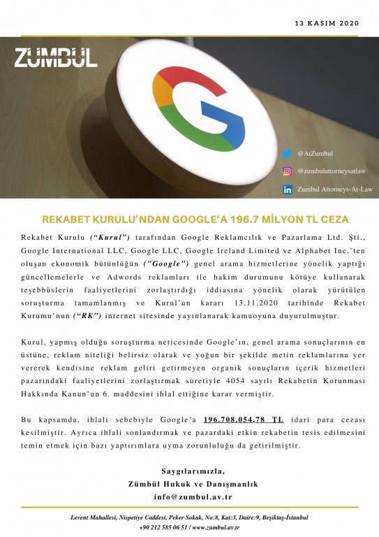 Duyurular Anasayfa Yayınlar&Duyurular Duyurular REKABET KURULU’NDAN GOOGLE’A 196.7 MİLYON TL CEZA Geri REKABET KURULU’NDAN GOOGLE’A 196.7 MİLYON TL CEZA