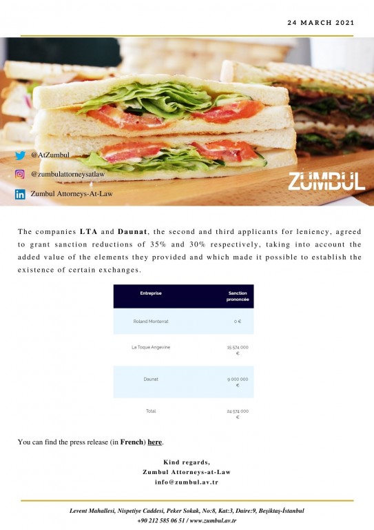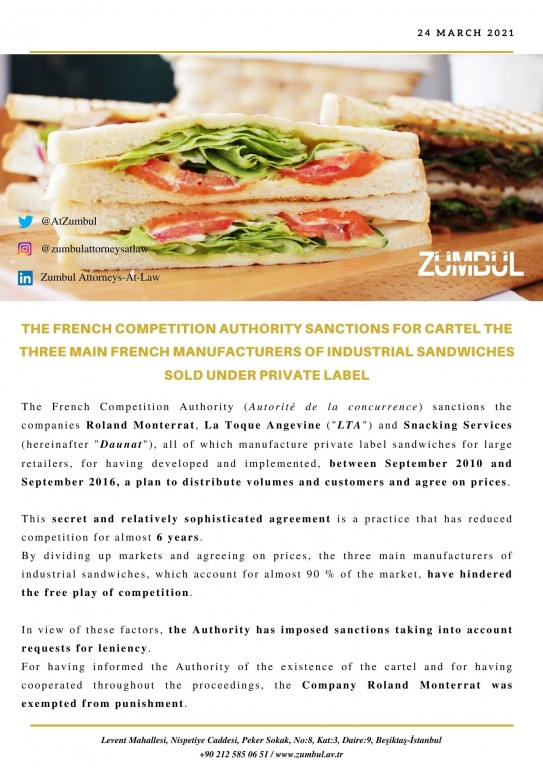 Duyurular Anasayfa Yayınlar&Duyurular Duyurular THE FRENCH COMPETITION AUTHORITY SANCTIONS FOR CARTEL THE THREE MAIN FRENCH MANUFACTURERS OF INDUSTRIAL SANDWICHES SOLD UNDER PRIVATE LABEL Geri THE FRENCH COMPETITION AUTHORITY SANCTIONS FOR CARTEL THE THREE MAIN FRENCH MANUFACTURERS OF INDUSTRIAL SANDWICHES SOLD UNDER PRIVATE LABEL