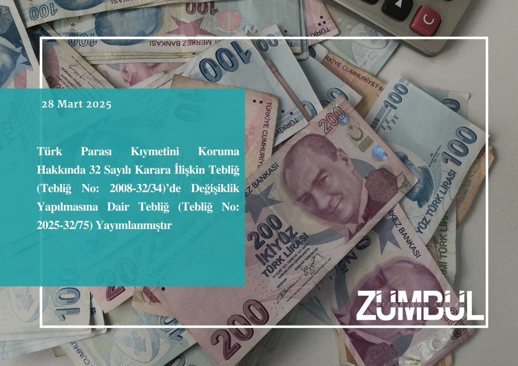 Hazine ve Maliye Bakanlığı tarafından hazırlanan Türk Parası Kıymetini Koruma Hakkında 32 Sayılı Karara İlişkin Tebliğ (Tebliğ No: 2008-32/34)’de Değişiklik Yapılmasına Dair Tebliğ (Tebliğ No: 2025-32/75) (“Tebliğ”) 28.03.2025 tarihli ve 32855 sayılı Resmî Gazete’de yayımlanmıştır.